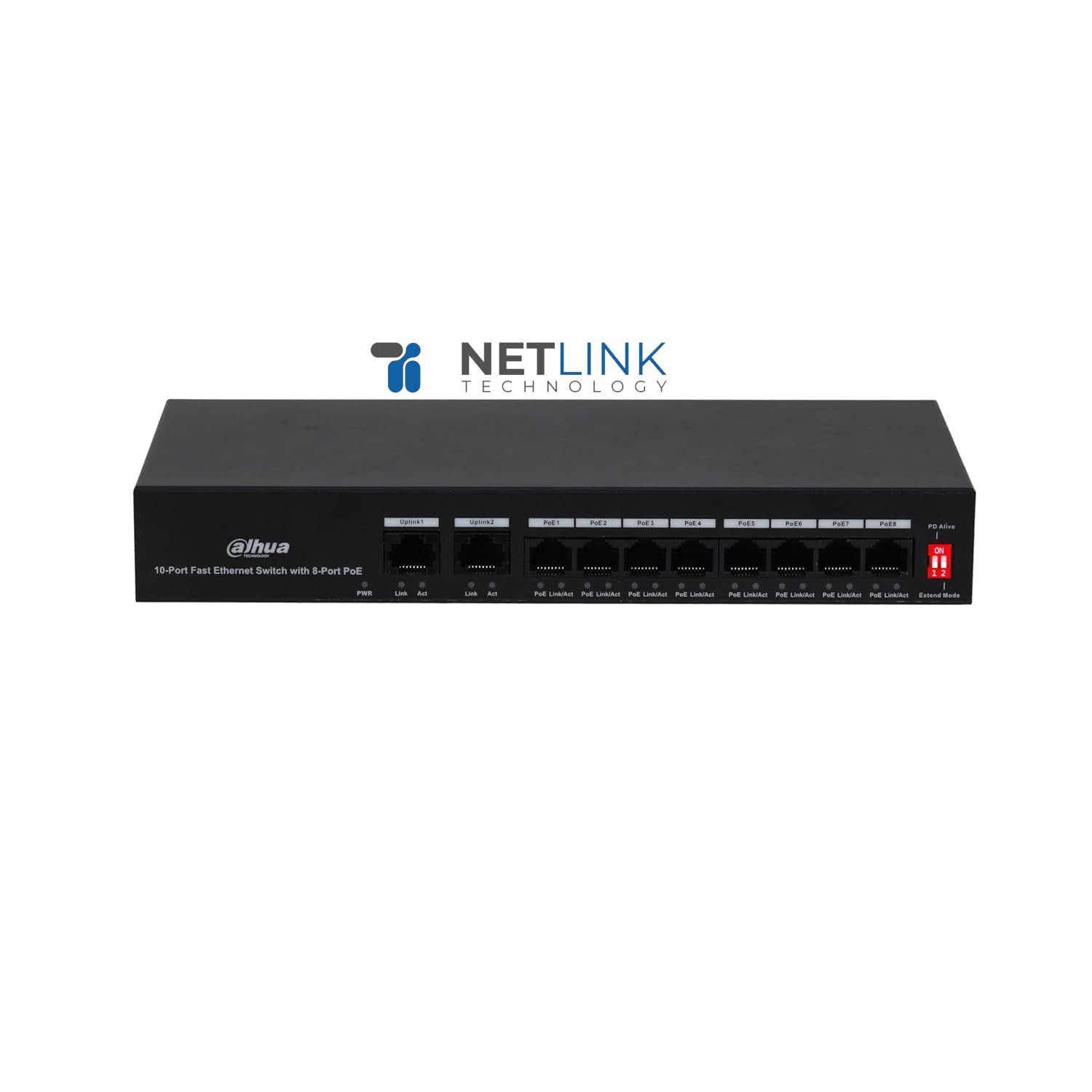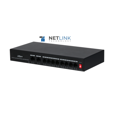 > Support eight 10/100M PoE power supply ports, and two 10/100M uplink ports